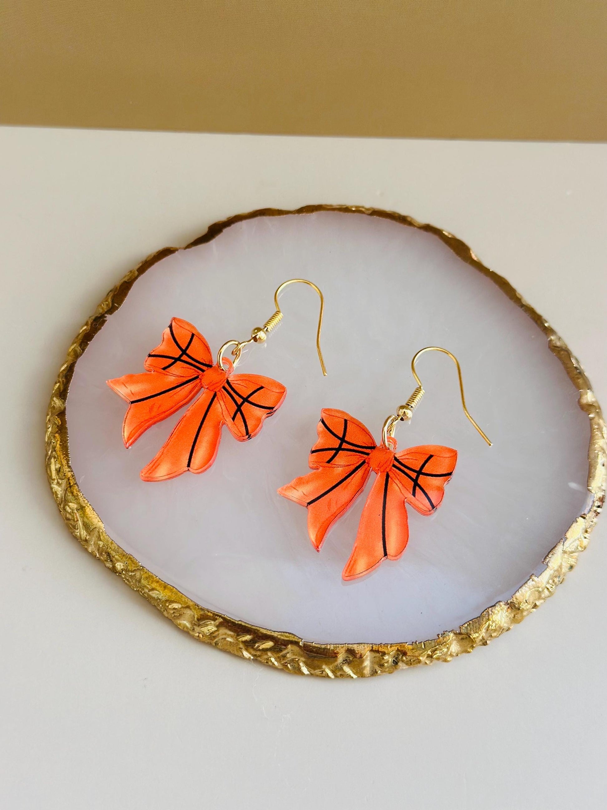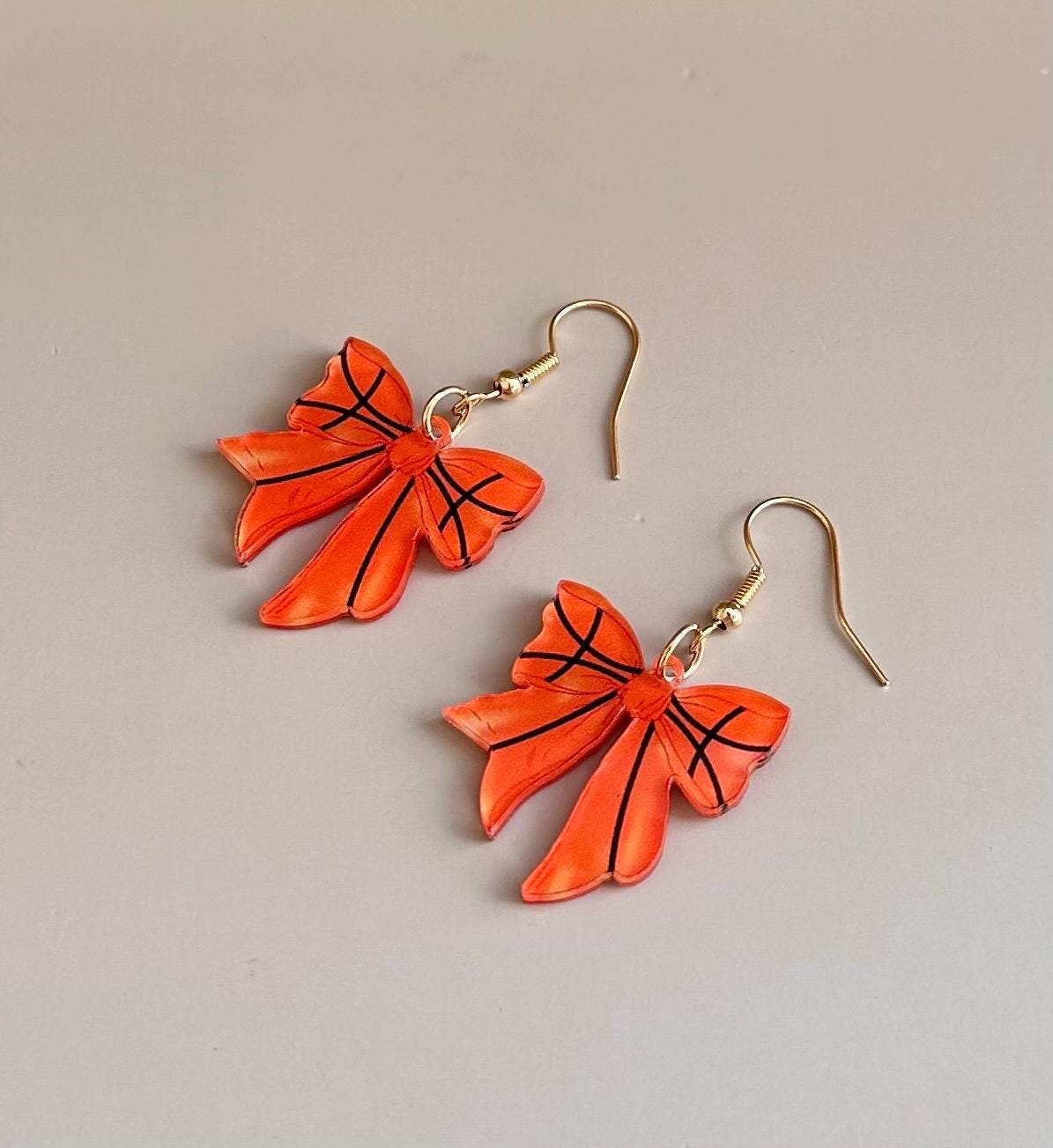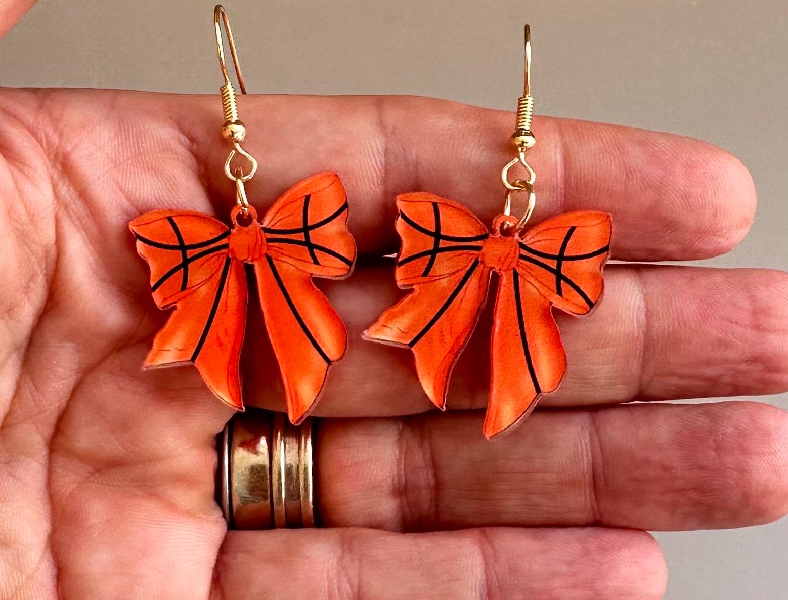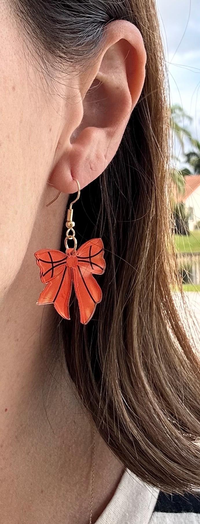 Basketball Earrings. Bow Earrings. Basketball Style Earrings. Basketball Jewelry. Basketball Mom Earrings. Basketball Girlfriend Earrings. Cute Bow. Acrylic Bow Earrings Sports Themed for Basketball Game Day and Basketball Cheerleaders.