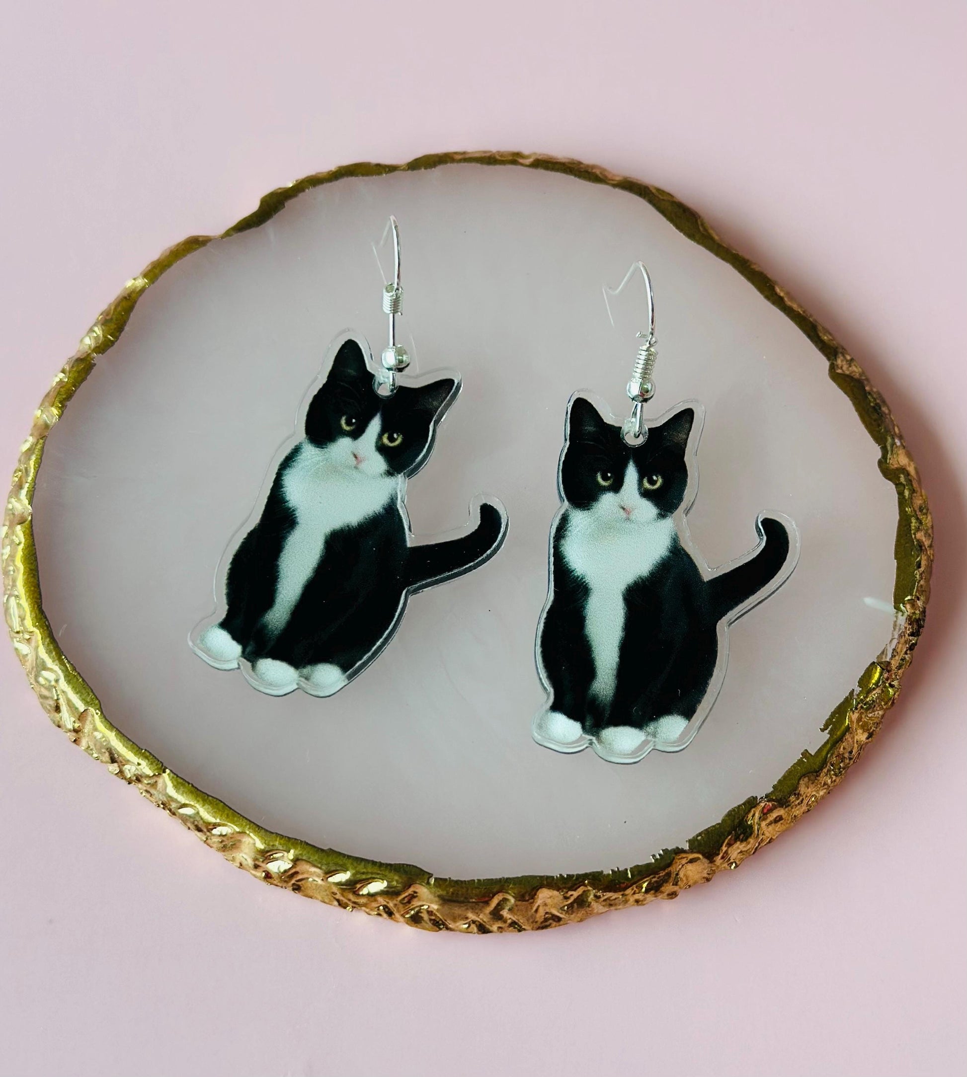 Cat Earrings Black and White Cat Acrylic Pendant Persian Cat Lover Crazy Cat Lady Gift Cat Lover Jewelry Cat Mom Earrings Cat Jewelry Black Cat.