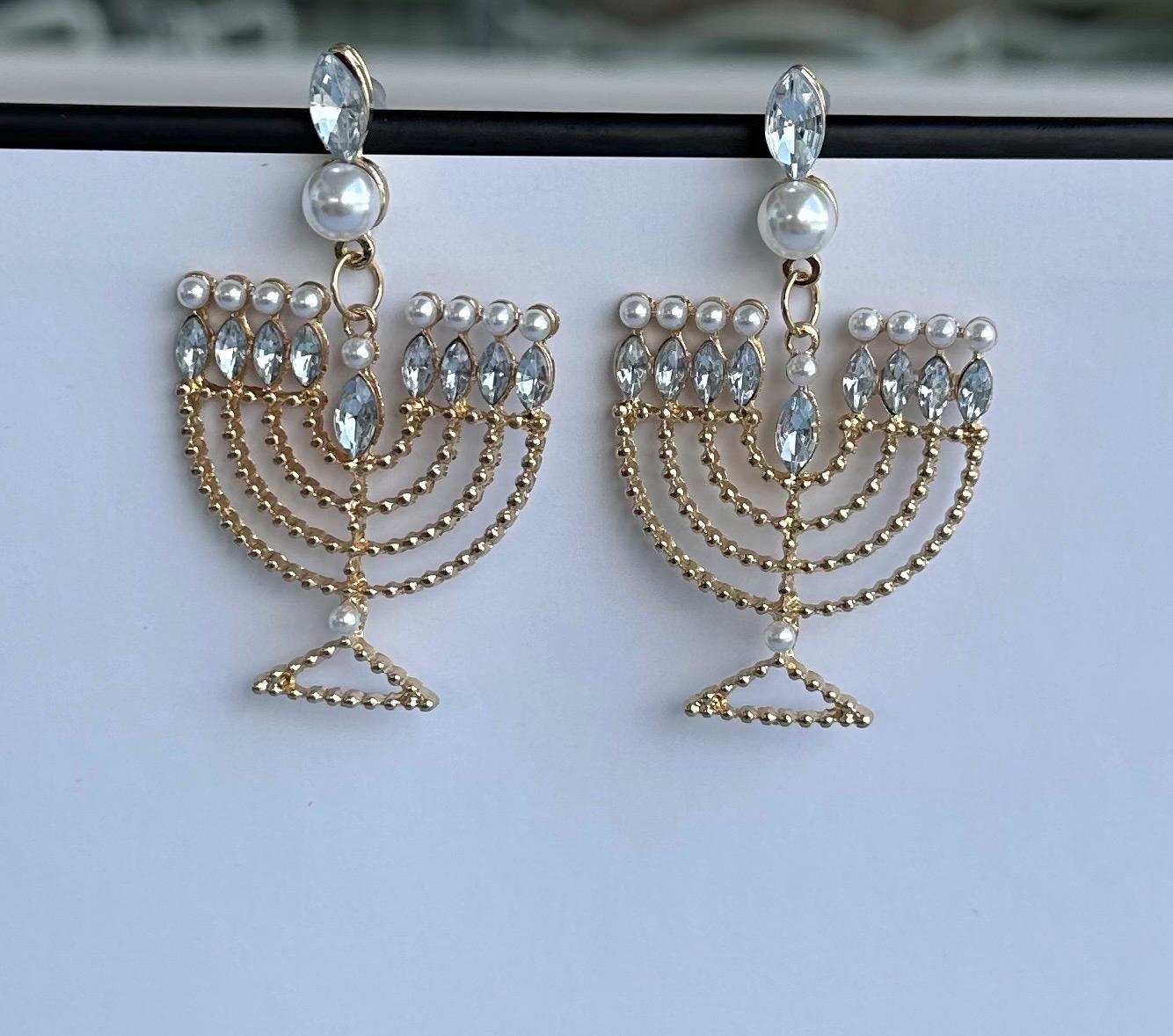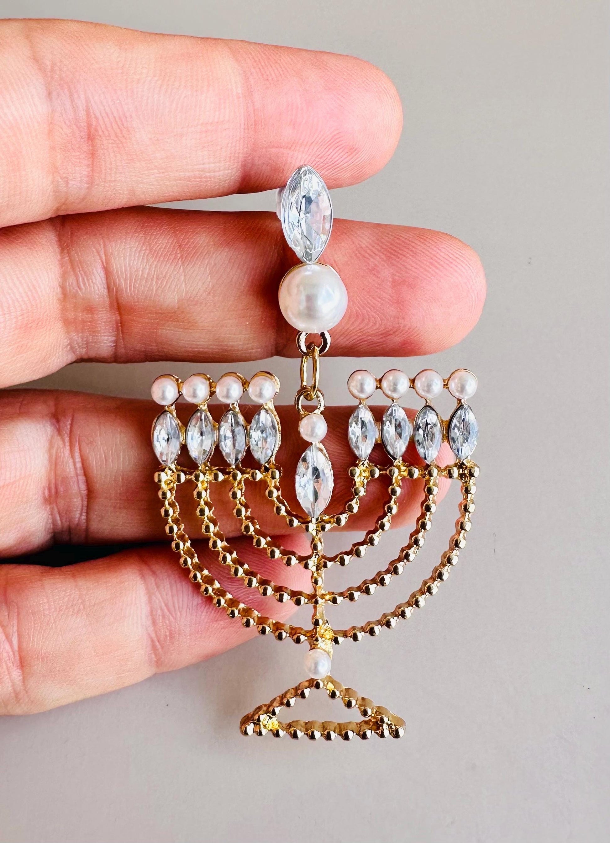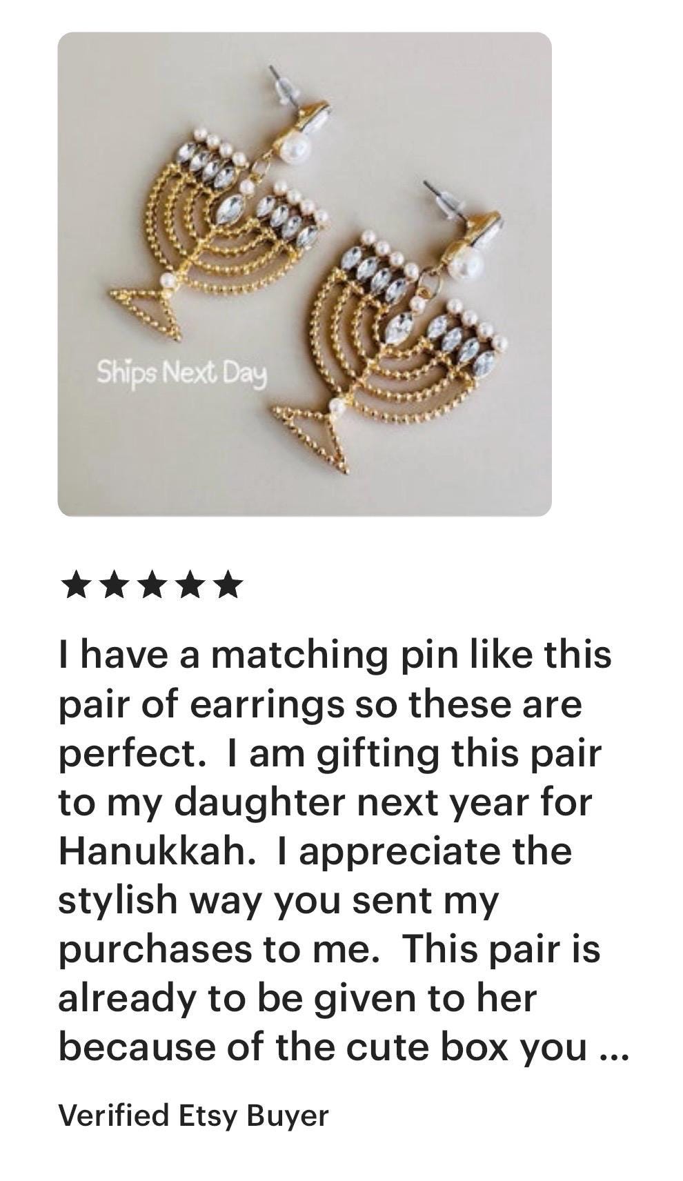 These Menorah earrings are a stunning piece of Jewish jewelry, featuring golden and pearl colors and handcrafted with care. Perfect as a Bat Mitzvah gift or a thoughtful present for girlfriends, daughters, or teachers, these earrings serve as both a beautiful accessory and a meaningful expression of faith and cultural identity.
