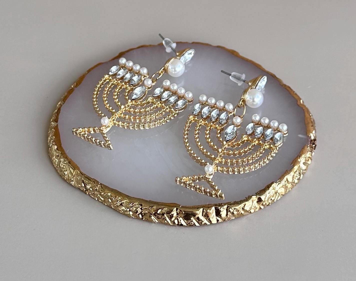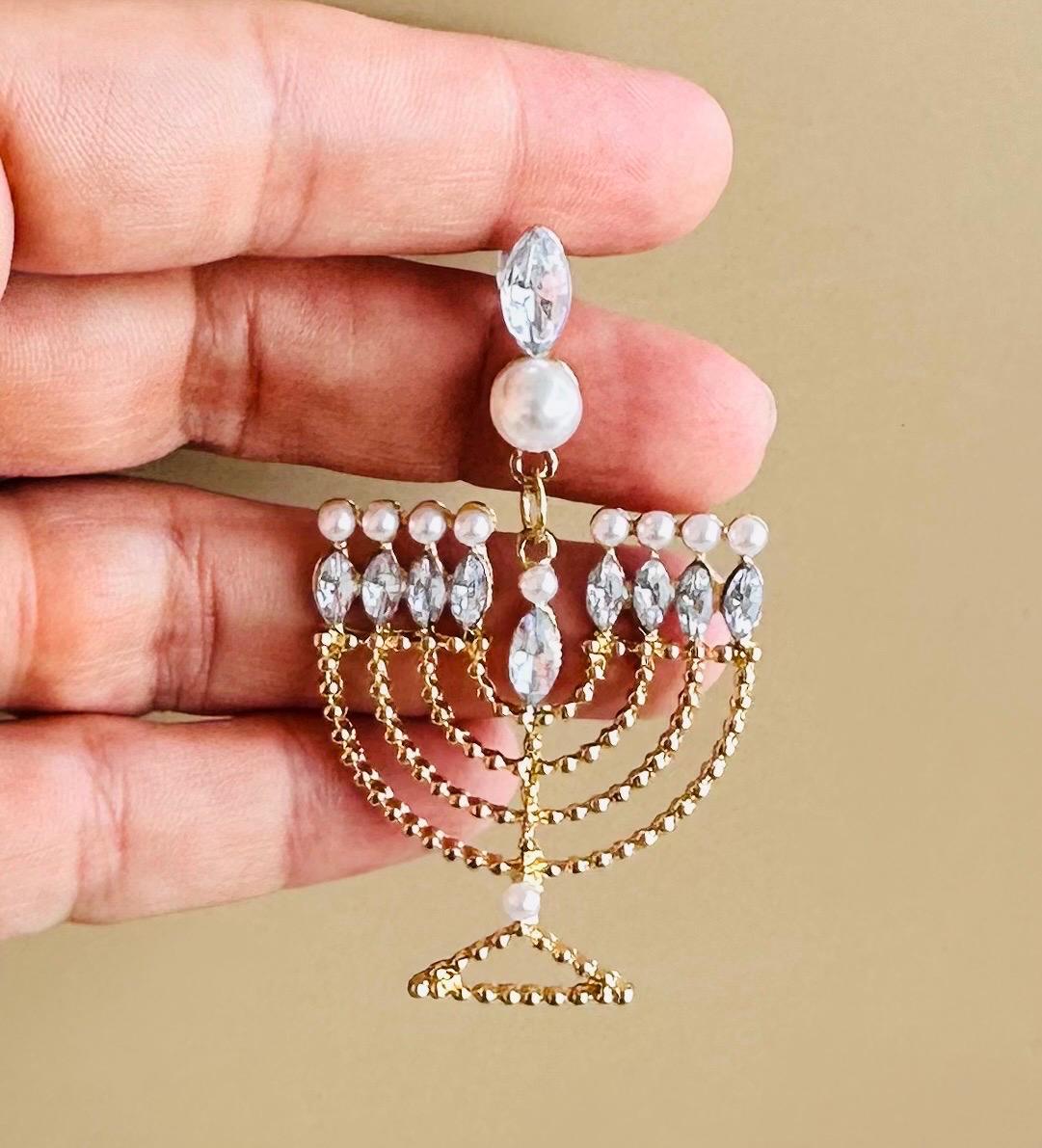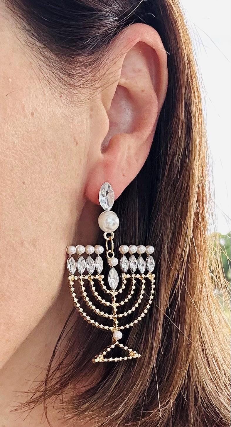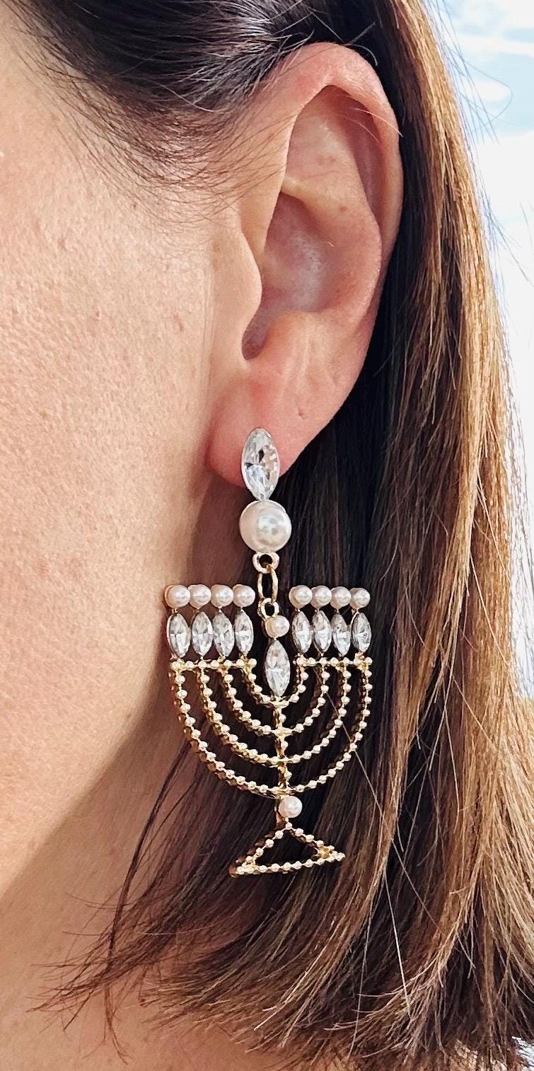 These Menorah earrings are a stunning piece of Jewish jewelry, featuring golden and pearl colors and handcrafted with care. Perfect as a Bat Mitzvah gift or a thoughtful present for girlfriends, daughters, or teachers, these earrings serve as both a beautiful accessory and a meaningful expression of faith and cultural identity.