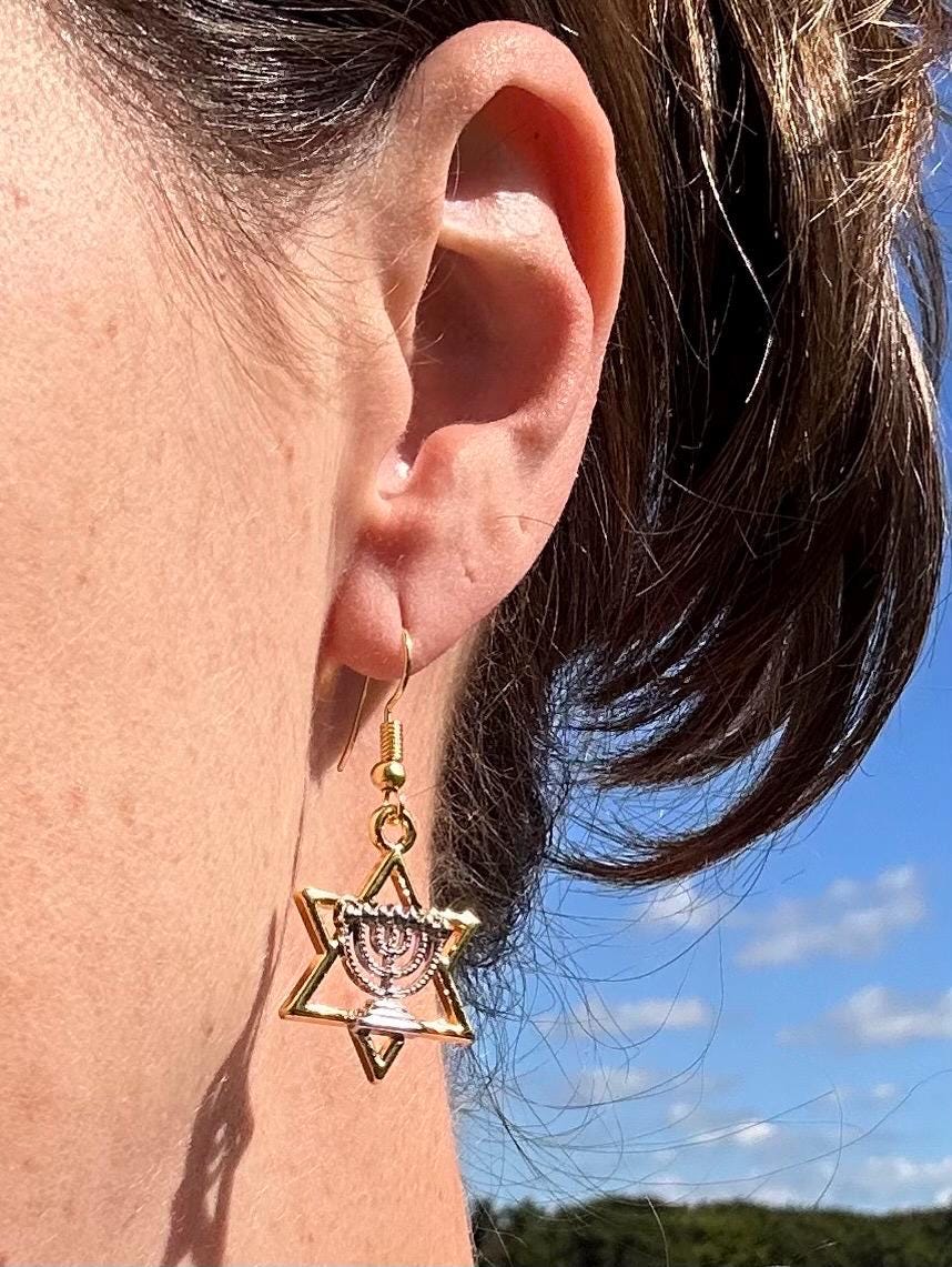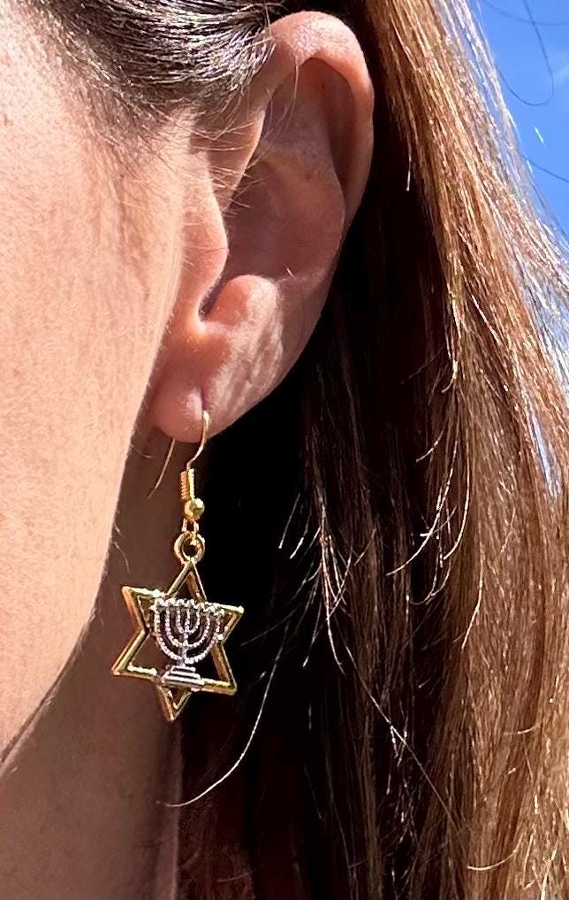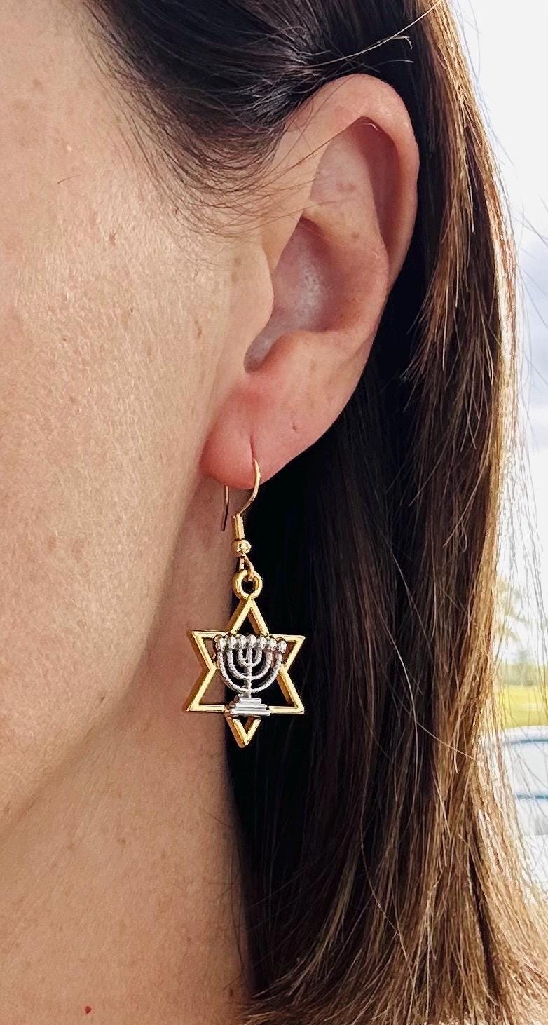 These Menorah earrings are a stunning piece of Jewish jewelry, featuring golden and silver colors and handcrafted with care. Perfect as a Bat Mitzvah gift or a thoughtful present for girlfriends, daughters, or teachers, these earrings serve as both a beautiful accessory and a meaningful expression of faith and cultural identity.