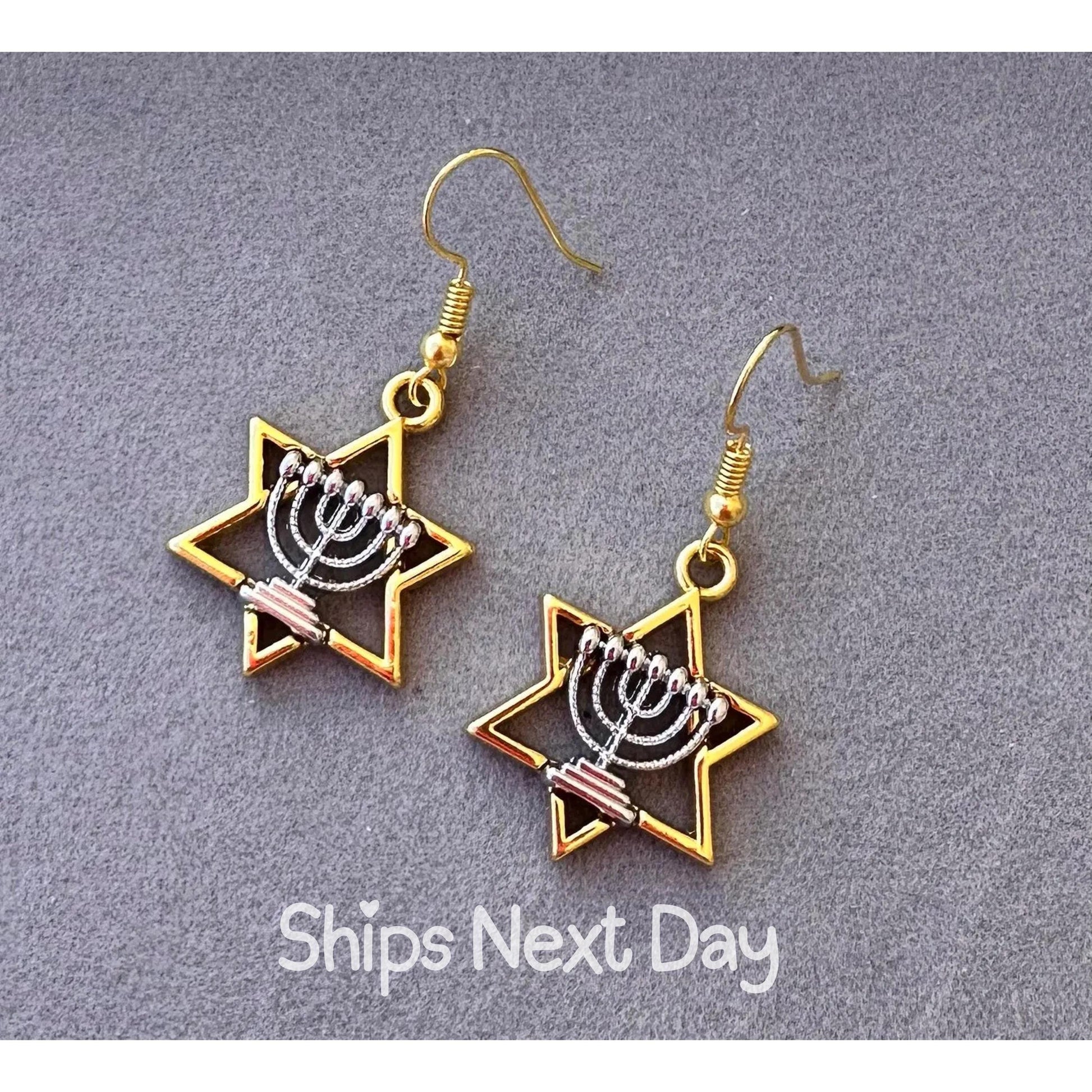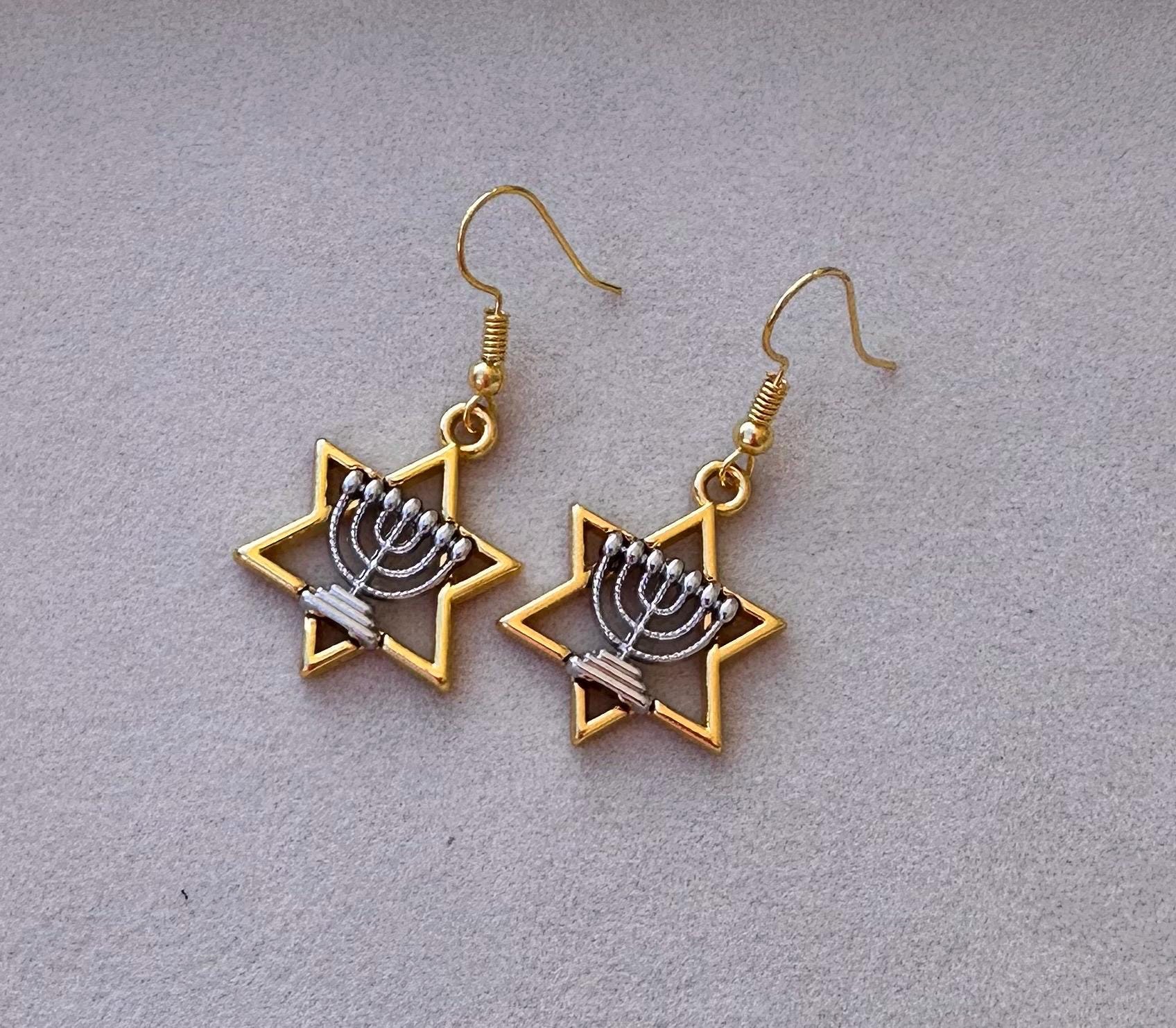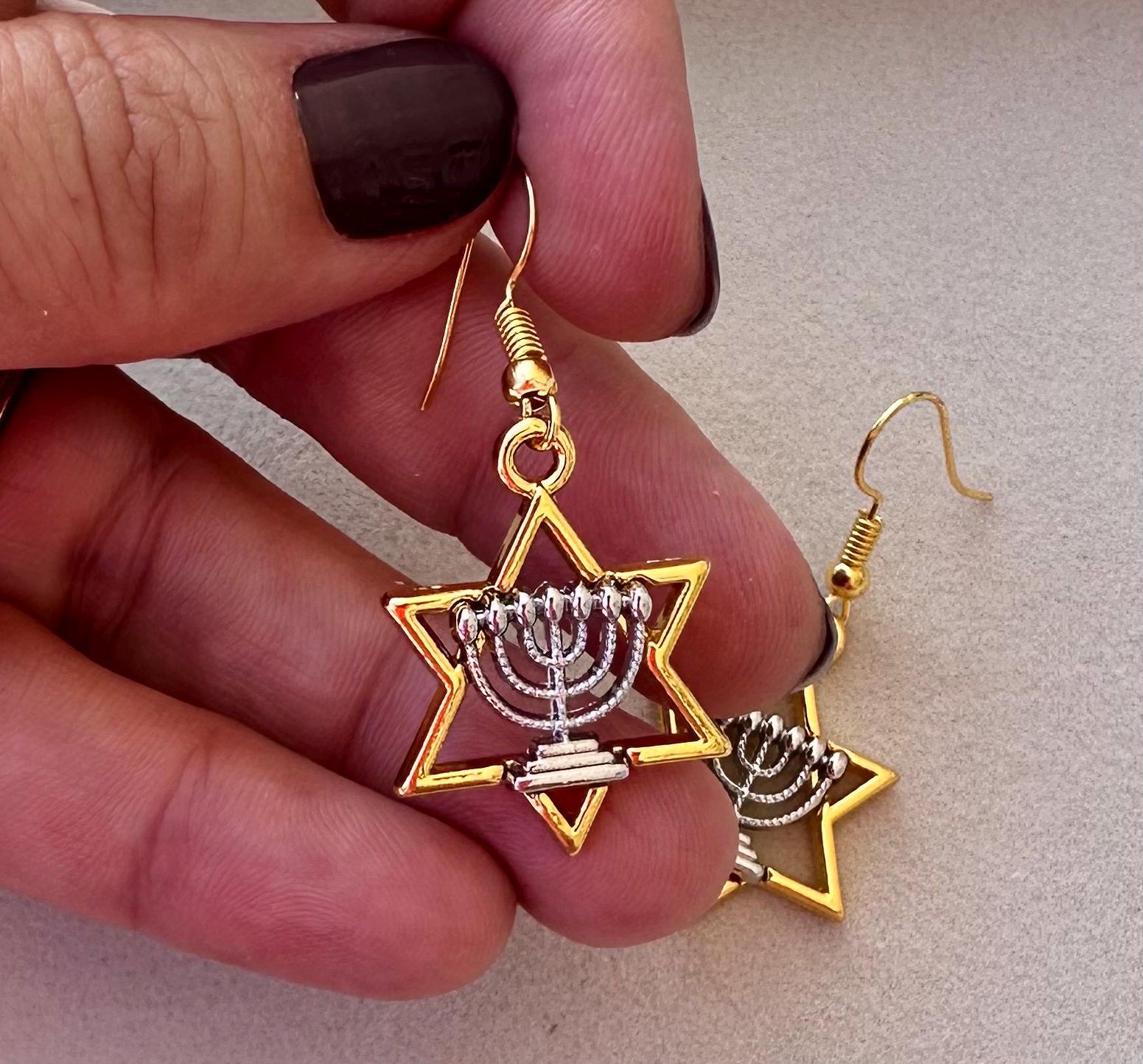 These Menorah earrings are a stunning piece of Jewish jewelry, featuring golden and silver colors and handcrafted with care. Perfect as a Bat Mitzvah gift or a thoughtful present for girlfriends, daughters, or teachers, these earrings serve as both a beautiful accessory and a meaningful expression of faith and cultural identity.
