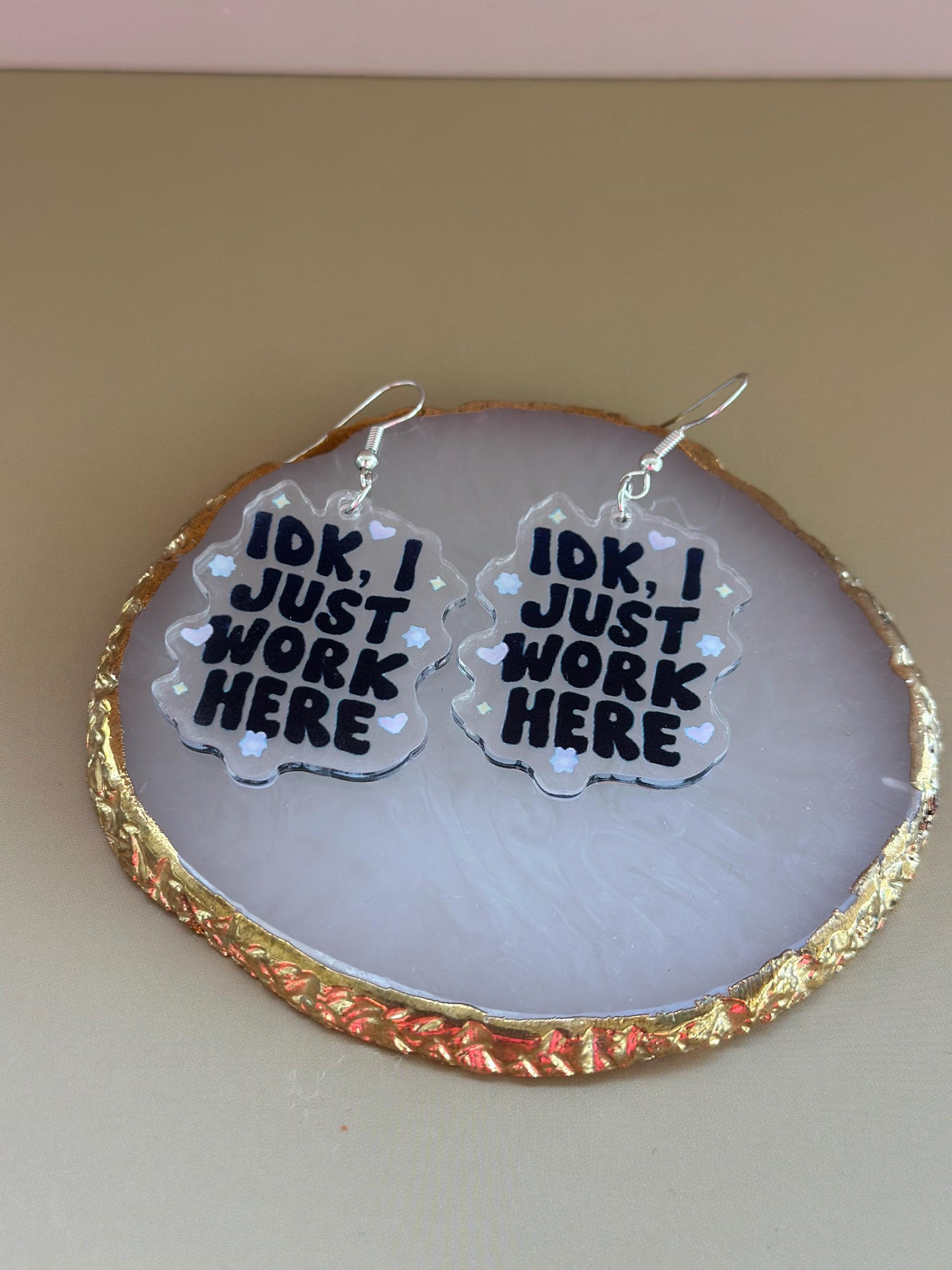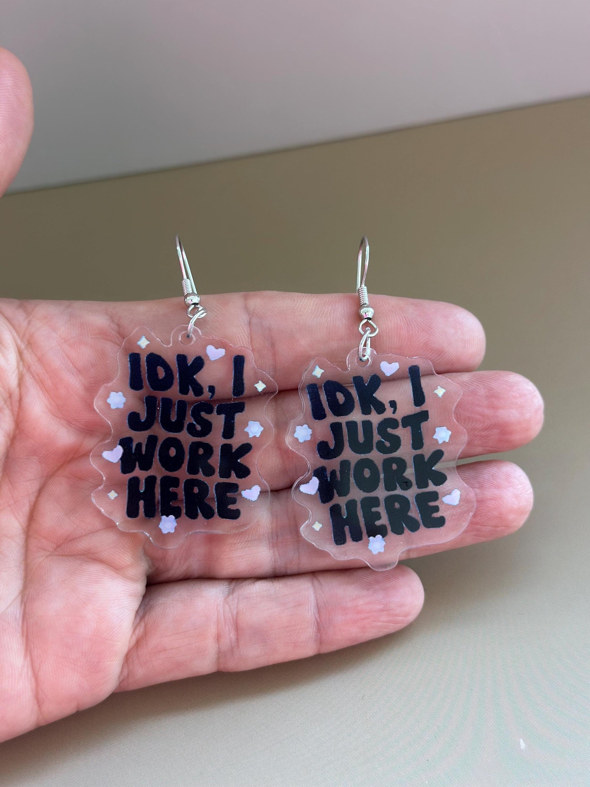 Crystal Clear IDK I just Work Here Earrings Funny Valentines Day Gift Funny Office Earrings I Don't Know Jewelry Coworker Gift Office Day Earrings Sarcastic Earrings.