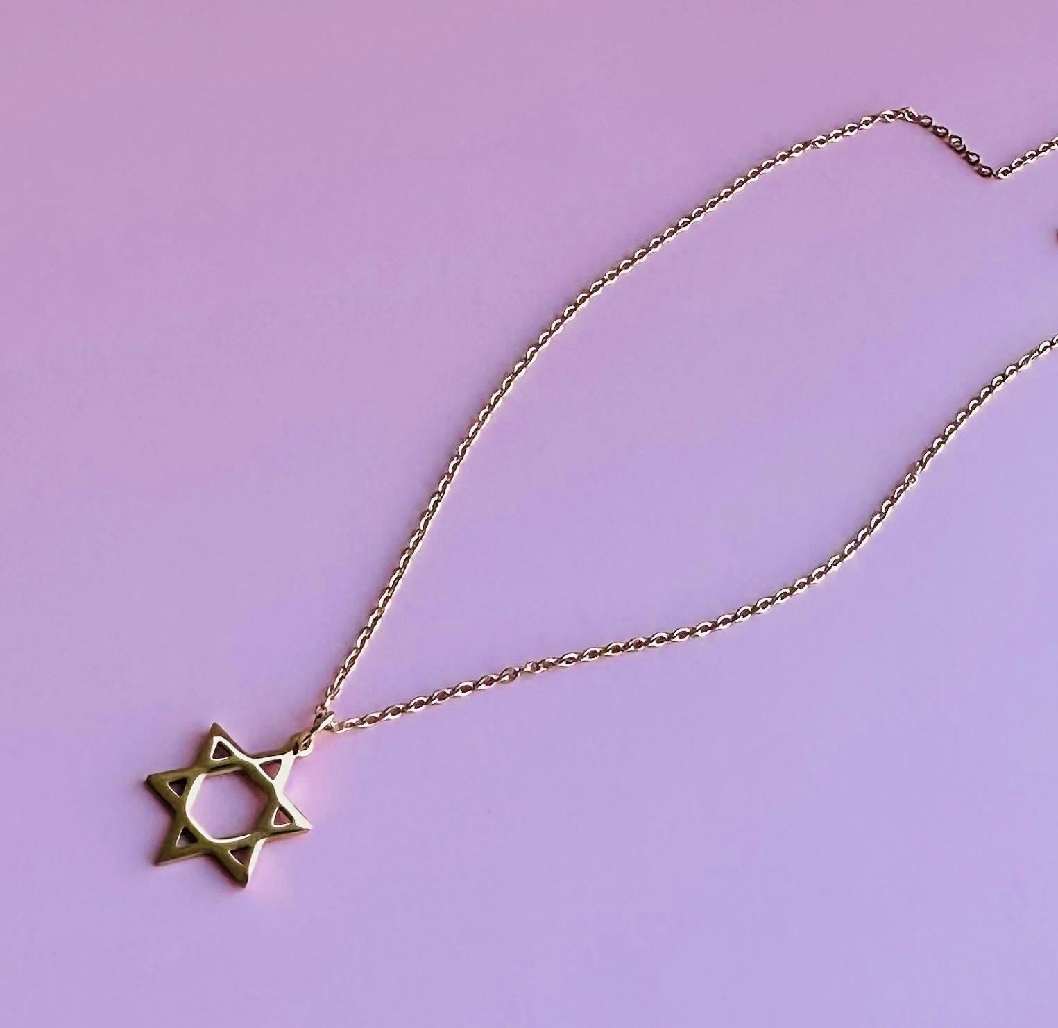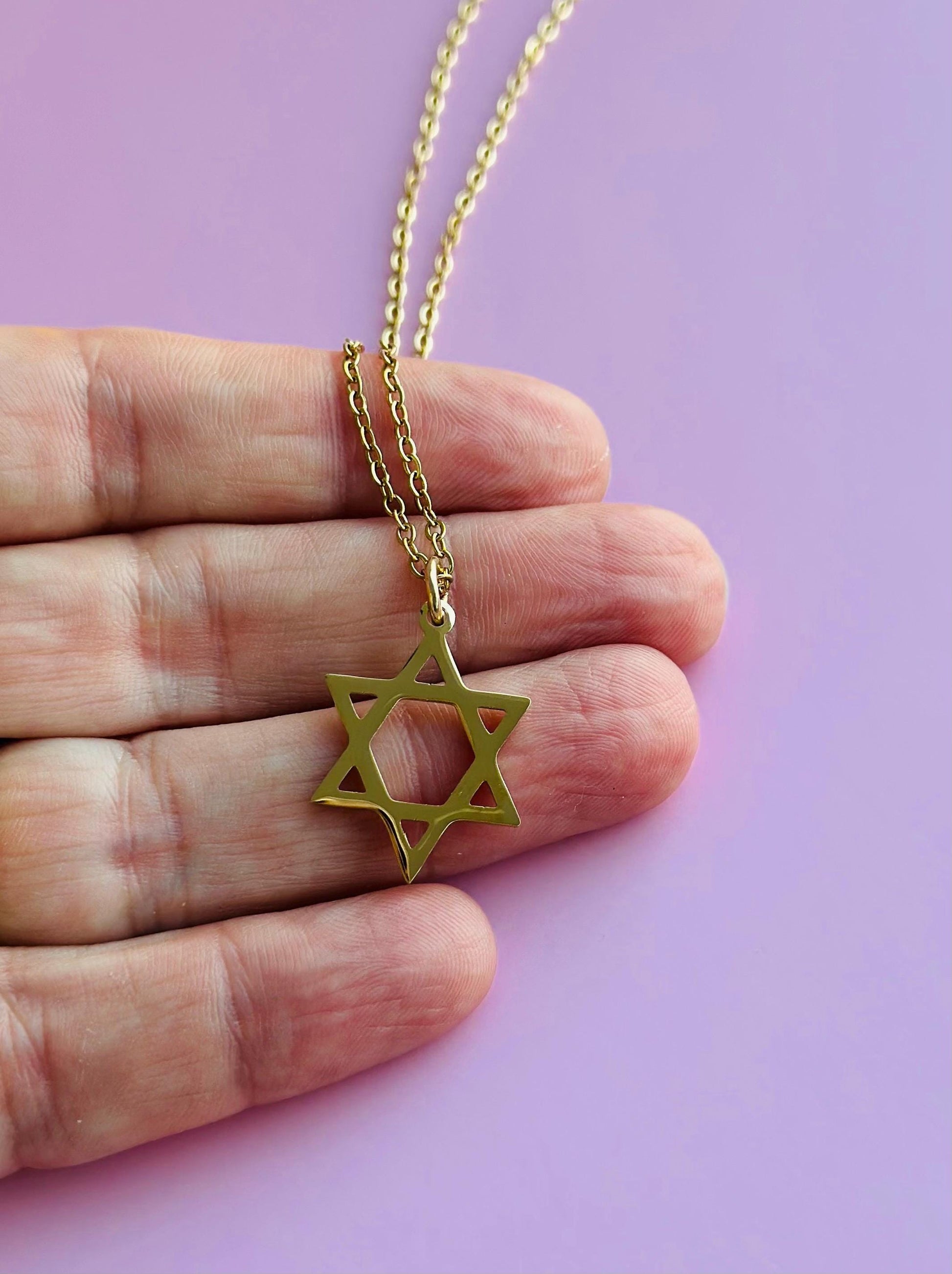 - Spiritual Meaning: It signifies the connection between heaven and earth, as well as spiritual protection. Beyond its symbolic meaning, wearing Star of David jewelry is often a personal statement of faith and identity, reflecting solidarity with Jewish heritage and beliefs wherever one goes. Measurements: Chain 44cm. Star 1.5 x 2 cm. ❤️Thank you for stopping by at TrendyPrintLove! This Necklace is made-to-order just for you❤️ ❤️ Please check here (trendyprintlove.etsy.com) and click the "❤️" Follow Shop to get newer interesting, designed updates. ⭐️Customer Service: If you have any questions or special requests do not hesitate to contact us. We're here to assist you however we can, and your satisfaction is our priority. Due to your monitor or mobile screen colors may differ slightly. Please contact us if you have problems with your order. We would be very happy to solve it. ✔️ Returns and Exchanges Additional We will gladly do a one-time exchange of an item you ordered and received it at fault for defects. Unworn items are sent back to us within 7 days of receiving order. Please contact us via Etsy for return address. Buyers are responsible for all shipping costs. Since all items are made to order we will not accept returns to refund. ALL SALES ARE FINAL! Please contact us if you have problems with your order. We would be very happy to solve it. ✿ Processing time Please note that all our items are individually made with love for each of our very special buyers. While we do our best to ship them out as quickly as we can, please allow up to 10days for creation time after we receive your payment. ➤ Shipping The approximate shipping time is 3-5 business days. We will ship your order to the address you provided during checkout. We are not responsible if you left an incorrect shipping address, and the package wasn't delivered on time. You can contact us, no later than 2-3 hours after purchase, only on ETSY convos (not email) if you want us to ship your package to another address or upgrade your shipping method. If package returns due to incorrect or incomplete shipping address, buyer will be responsible for shipping charges for reshipping item. ★★ G I F T - N O T E ★★ • If you want to include a gift note while ordering, we will be happy to add a short handwriting gift note within your order. Please let us know your message at checkout. ★★ B E S T - G I F T ★★ • This necklace can be a special confirmation gift for your women, mother, lover, girlfriend, best friend, grandma, daughter, wife or family. Each jewelry will be packaged in a gift box, suitable for Bat Mitzvah, Hannukah, Birthday, Graduation, Anniversary, Christmas, Thanksgiving Day, Party Wedding and Valentine's Day. ❤️ instagram.com/trendyprintlove/